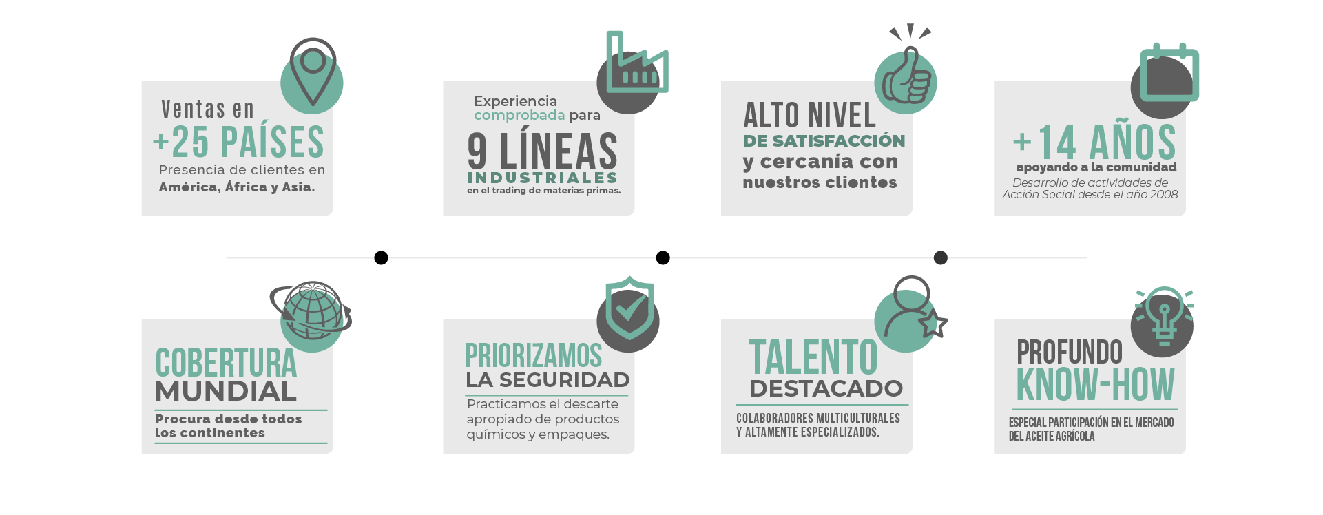 Para ello, sostenemos estrechas relaciones de representación con productores internacionales y fortalecemos alianzas comerciales con empresas de los sectores químico, petroquímico y con procesadores de aceites minerales y vegetales.